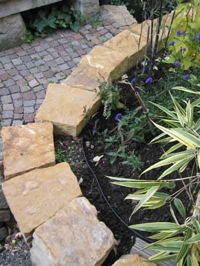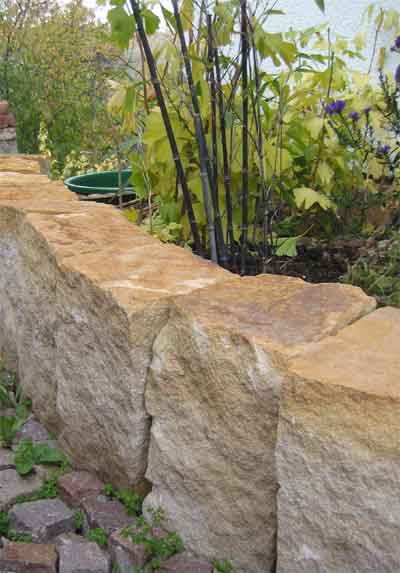 Beispiel Hochbeet (Sandsteineinfassung) Können ursprüngliche Planungen aufgrund erhöhten Grundwassers oder Felsenuntergrund nicht umgesetzt werden, da die erforderliche Einbautiefe nicht erreicht wird, ist es empfehlenswert, ein Hochbeet für die Bambuspflanzung anzulegen. ![]() |
